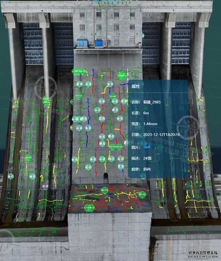 珈鷹科技運(yùn)用AI視覺技術(shù)對(duì)滲漏、表面結(jié)構(gòu)破損、裂縫等病害進(jìn)行智能檢測(cè),并實(shí)現(xiàn)目標(biāo)對(duì)象的坐標(biāo)定位及精準(zhǔn)量測(cè),在此基礎(chǔ)上對(duì)壩體進(jìn)行三維實(shí)景建模,缺陷自動(dòng)映射,在三維可視化平臺(tái)上持續(xù)更新,為大壩構(gòu)建量身定做的“病歷”數(shù)據(jù)庫。
