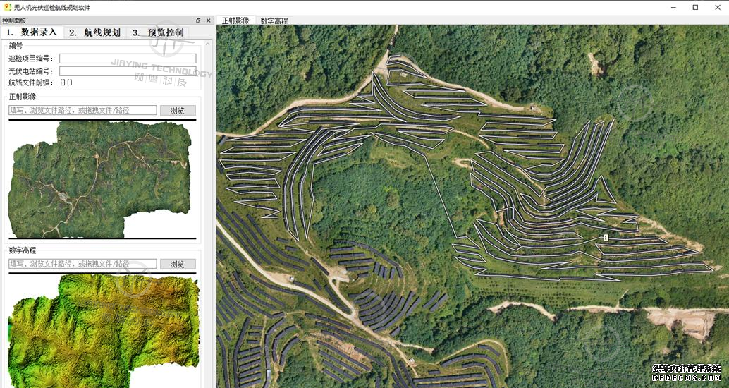 分析DOM正射影像和DEM數字高程模型,分析光伏電站的布局和地形特點,精細化規(guī)劃無人機的飛行路線,將光伏板的排列、地形的高程變化以及潛在安全隱患等因素考慮在內,優(yōu)化路線,進行巡線仿地飛行。