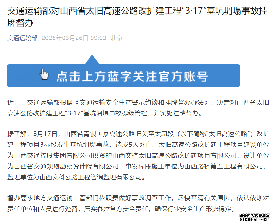 3月26日,交通運輸部在其官方公眾號通報稱,交通運輸部決定對山西省太舊高速公路改擴建工程“3·17”基坑坍塌事故提級管控,并實施掛牌督辦。督辦要求地方交通運輸主管部門依職責做好事故調查工作,盡快查清有關原因,依法依規對責任單位和人員進行處罰,壓實參建各方安全責任,確保行業安全生產形勢穩定。
